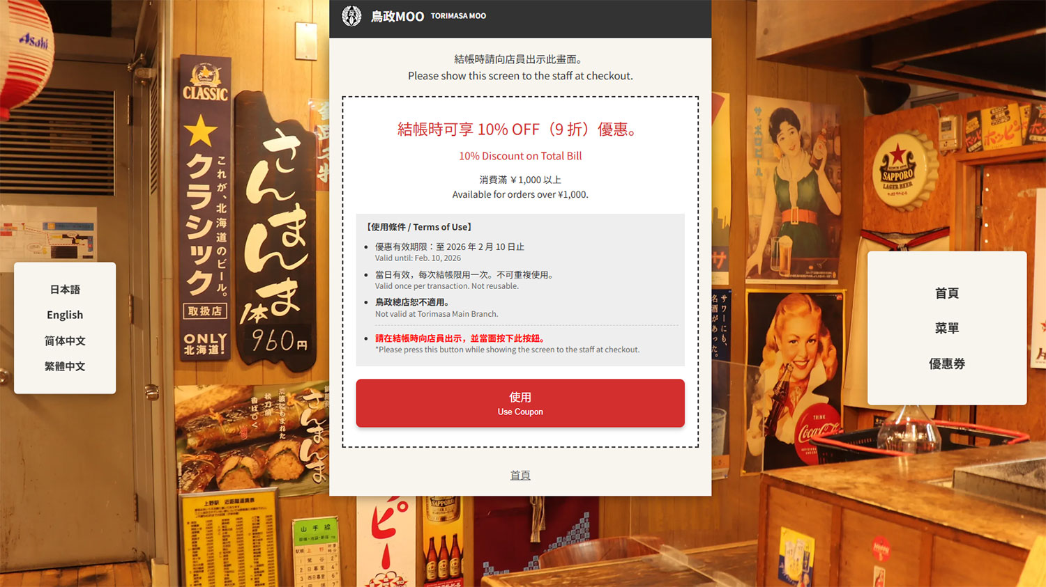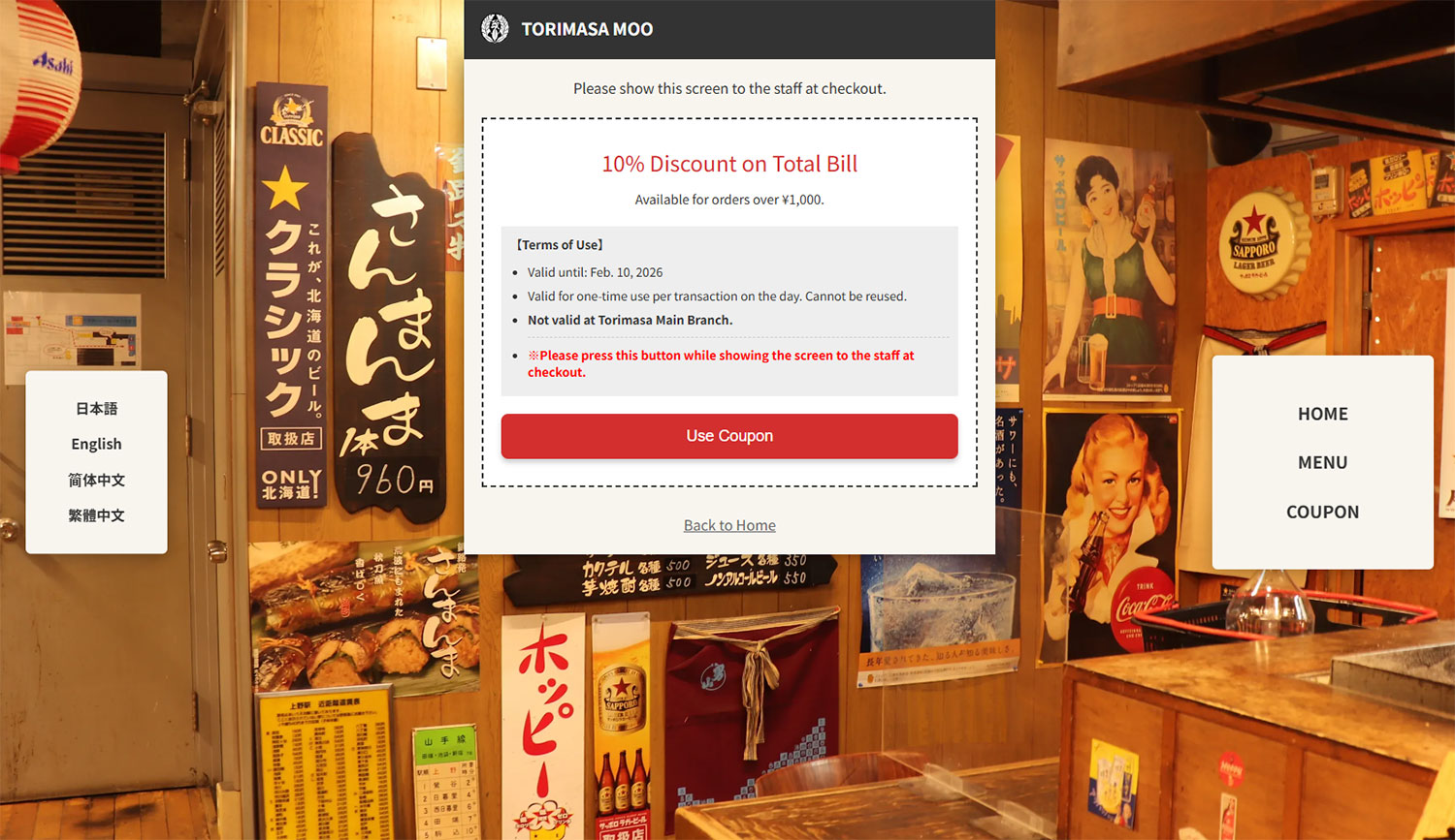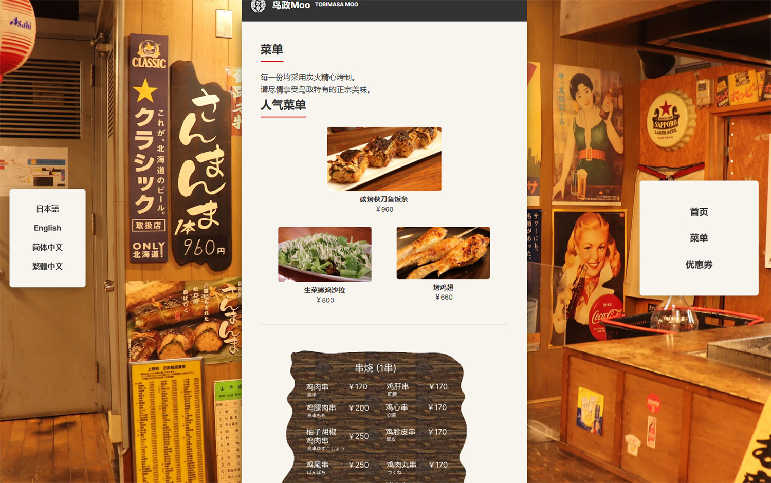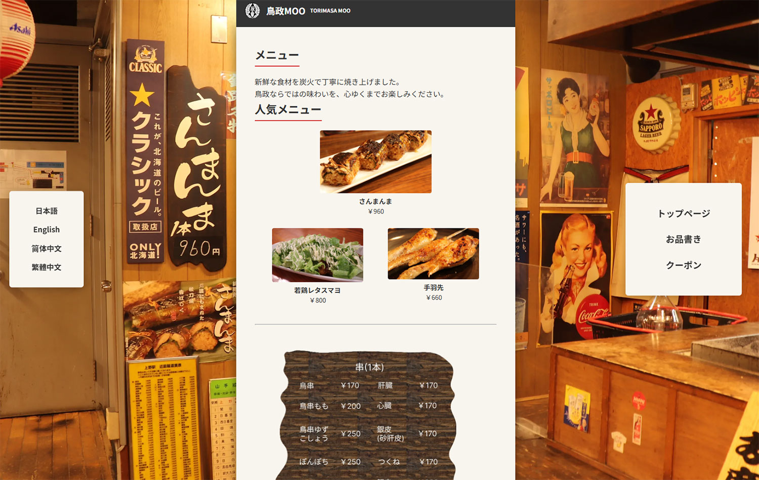 釧路市にある複合商業施設フィッシャーマンズワーフMOO(むー)にある焼き鳥屋の鳥政(とりまさ)MOO店の多言語ウェブサイトです。日本語・英語・中国語(繁体字と簡体字)の3言語4表記に対応しております。インバウンドによる外国人観光客の増加に伴い日本語だけでは「どういうお店なのか、その魅力はなんなのか」を的確に伝えることは難しく機会損失につながります。それを未然に防ぎつつ多くの方にお店を知ってもらうため、ウェブサイトにプラスしてサイト限定のクーポンを用意し、来店動機の創出を促します。