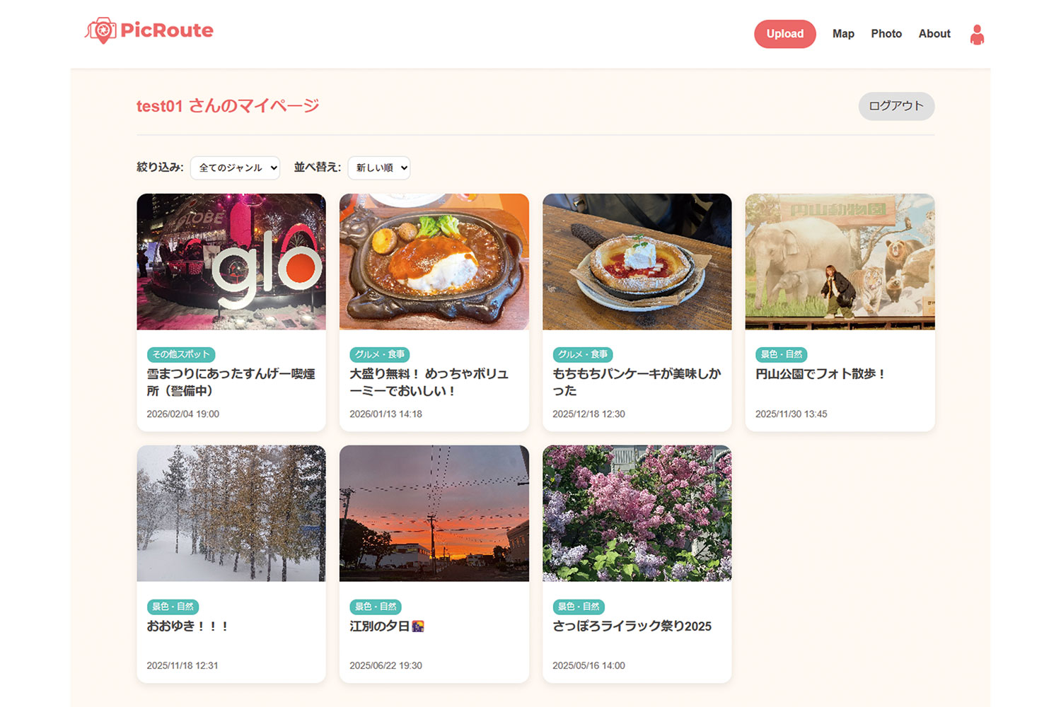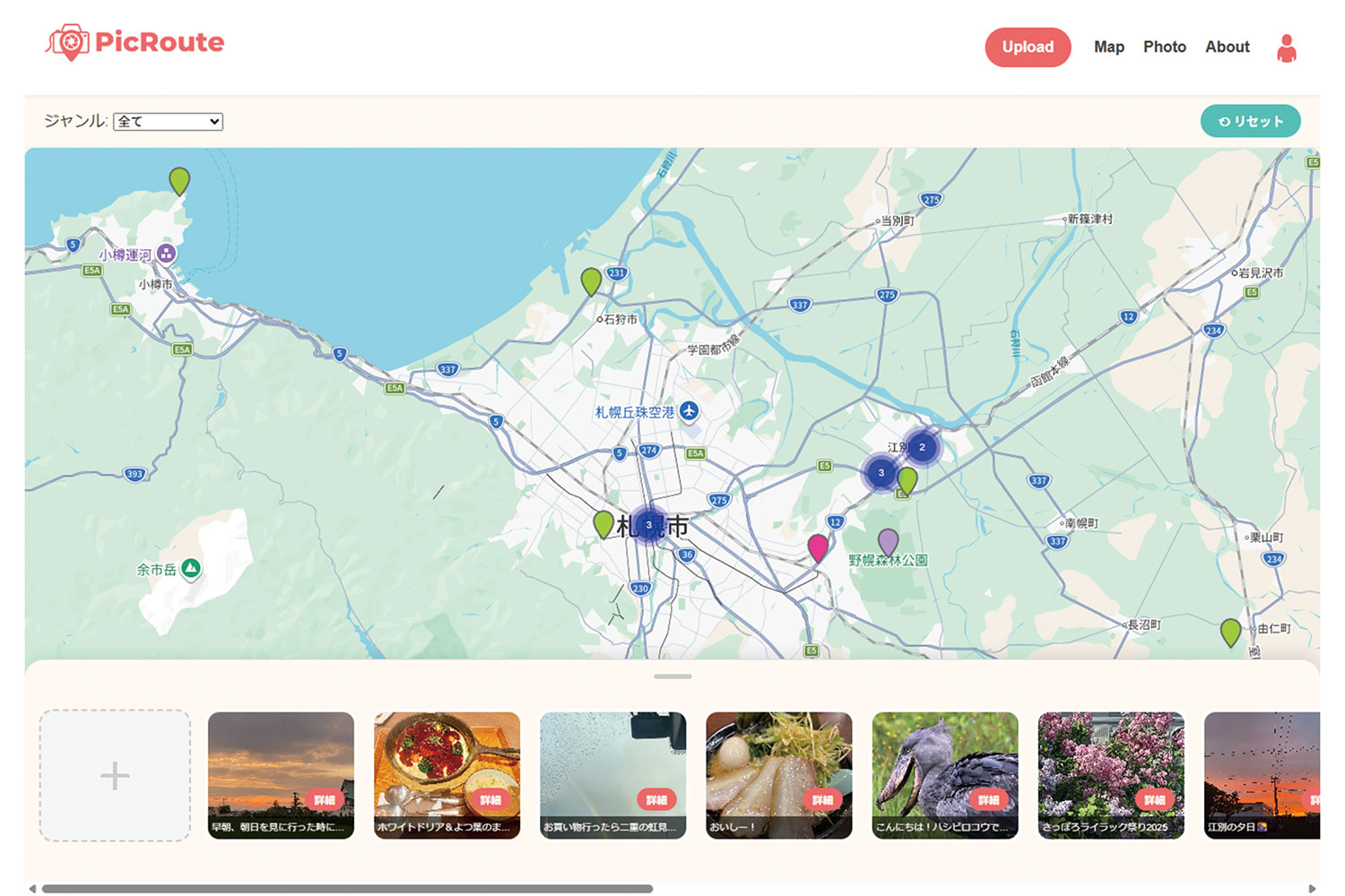さっぽろ連携中枢都市圏に特化した、写真から直感的に目的地を探せるユーザー投稿型フォトマップサイトです。 既存の地図アプリは文字検索が主流ですが、本作は「視覚的な憧れ」を入口に観光ルートを構想する新しい体験を提案します。画面下のパネルをスライドすると、今見ている地図範囲内の写真が一覧表示され、気に入った一枚をタップするだけでその場所へ即座にジャンプできます。 さらに、未来の訪問意欲を可視化する「行ってみたい!」ボタンを実装し、地域の隠れた魅力を資産化する仕組みを構築しました。