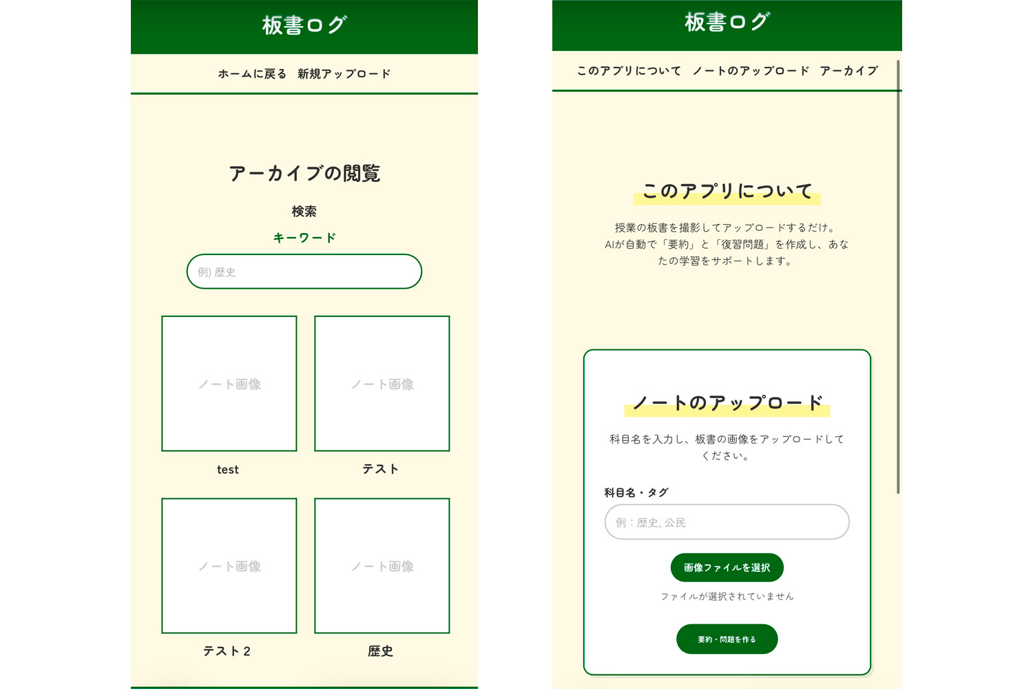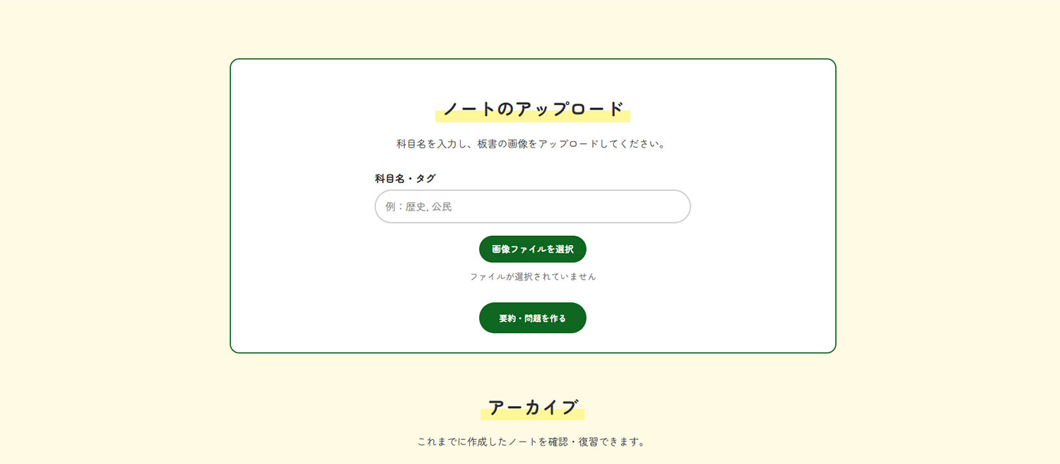 講義中に撮影した板書画像を活用し、復習を支援するWebアプリケーション「板書ログ」を開発しました。画像認識技術によって板書をテキスト化し、生成AIが要約ノートや復習問題を自動生成することで、復習の負担軽減と学習効率の向上を図りました。板書画像の整理や検索のしづらさといった課題を解消し、学習サイクルを一つのアプリ上で完結させている点が特徴です。ユーザーテストでも高い評価を得ており、講義後の自主学習を支援する有効性が示されました。