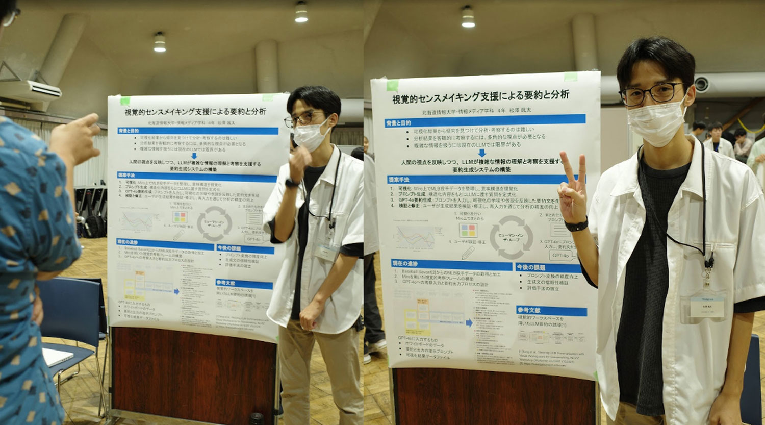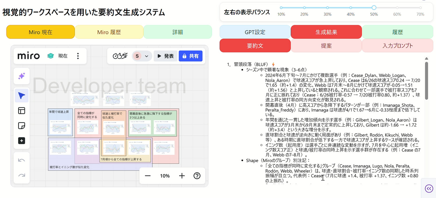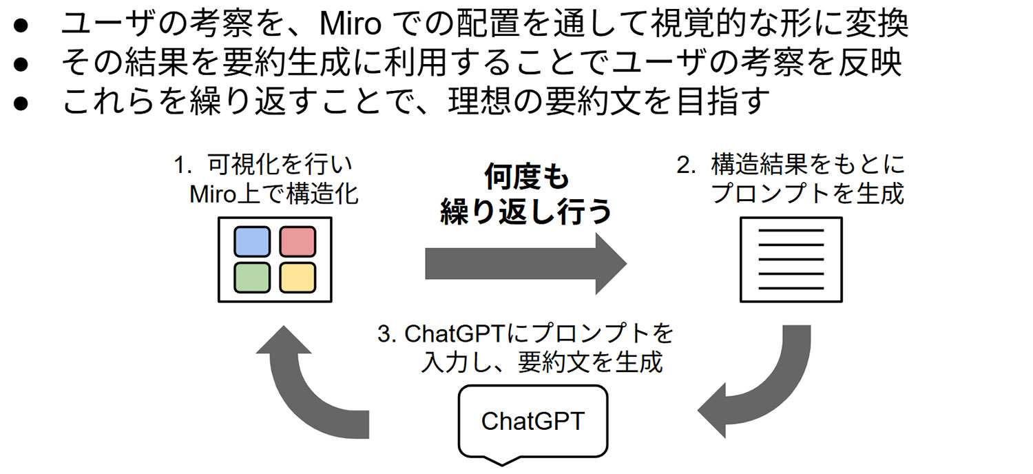 近年、大規模言語モデル(LLM)を用いた自動要約手法が広く利用されていますが、複数の可視化結果を比較する分析において、ユーザの分析意図や着眼点が要約に反映しにくいという課題があります。本研究では、複数の可視化画像を比較する分析作業を対象とし、ユーザの視覚的操作とLLMを統合することで、分析意図を反映した要約生成を支援する手法を提案します。提案手法では、Miro上で行われる画像の配置や囲みといった視覚的操作を分析意図として構造化し、ユーザが行った比較やグループ化を反映した要約文を自動生成します。