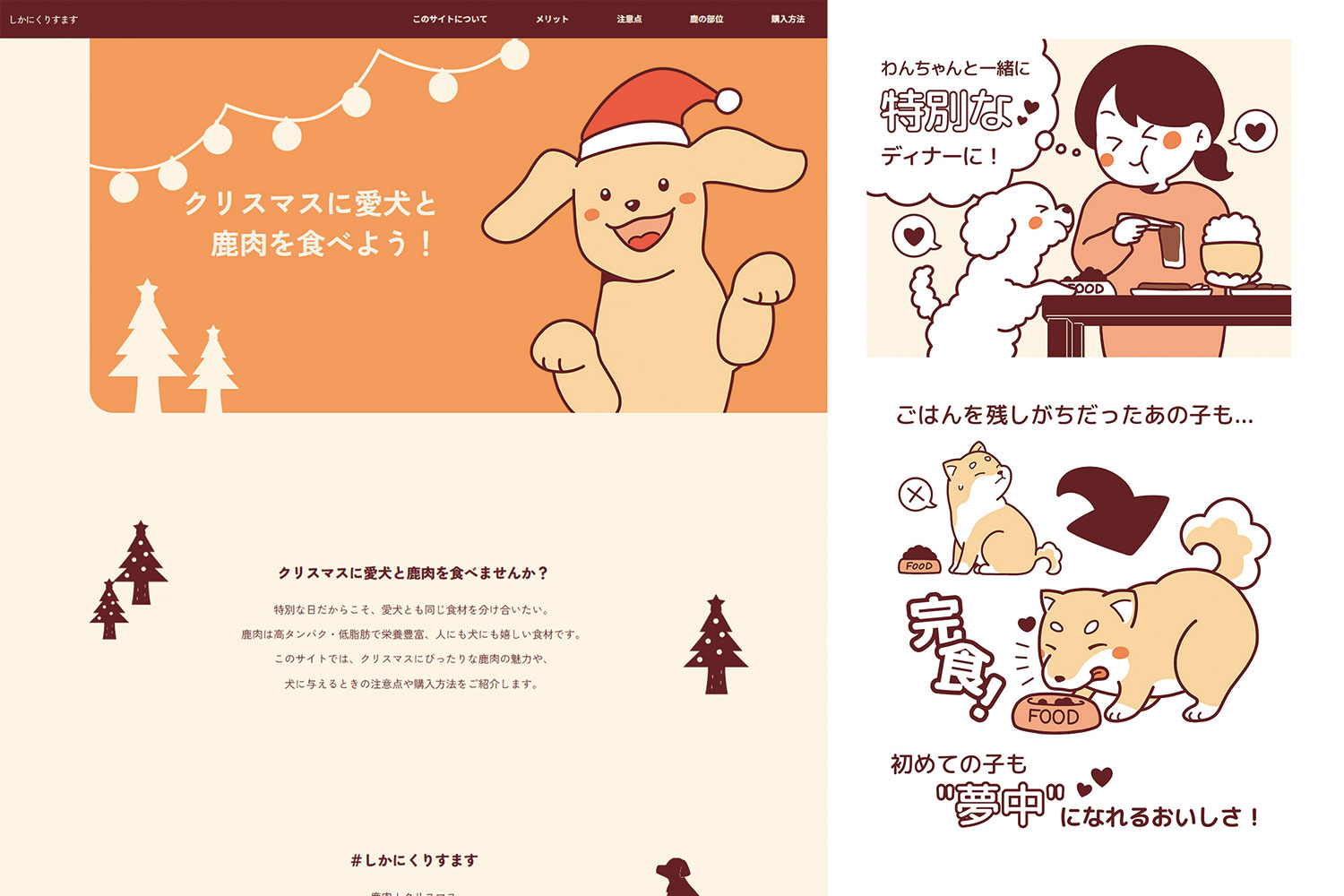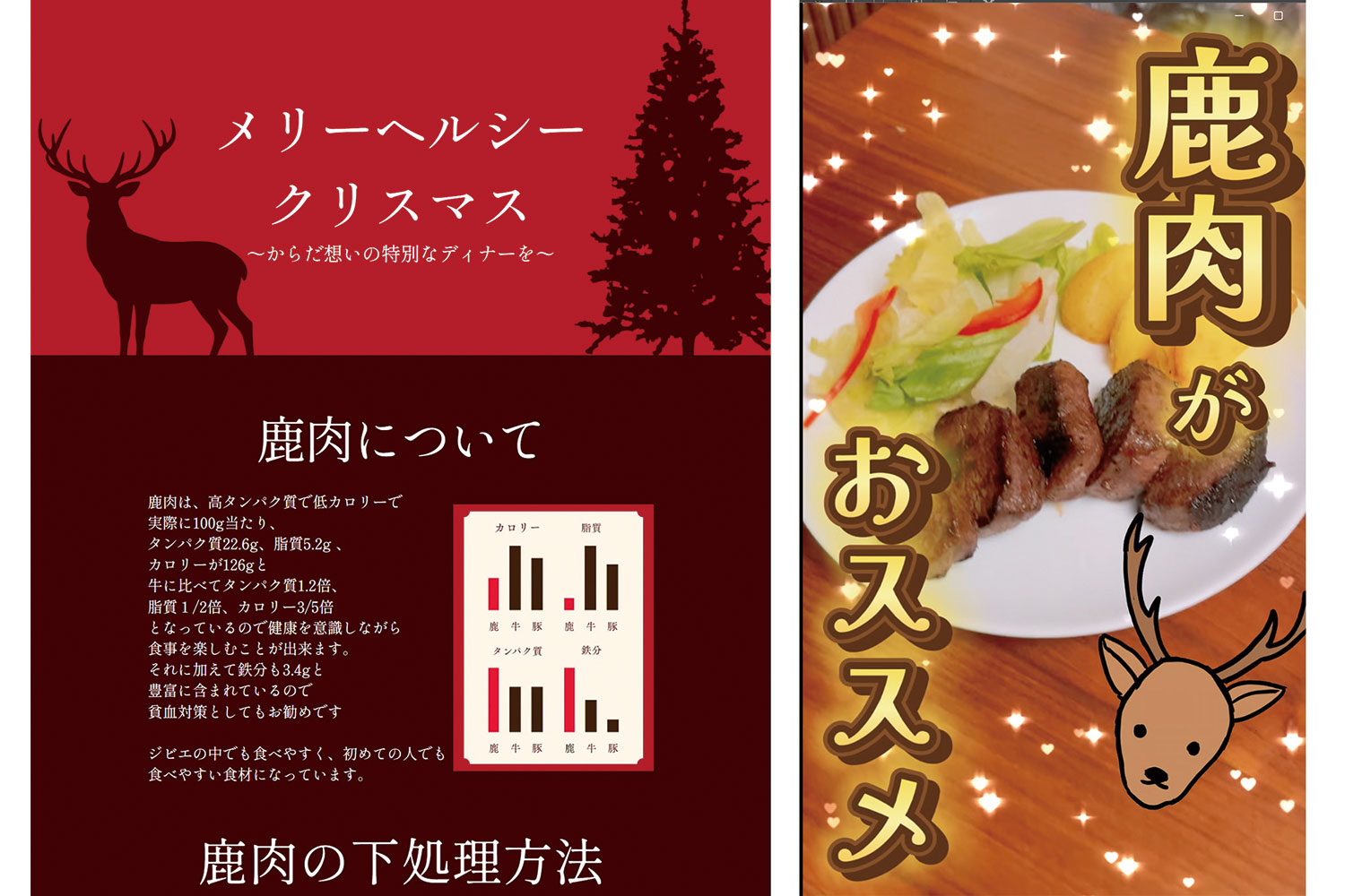 エゾシカの増加に伴い、農林業被害などが深刻な課題となっています。そこで進められているのがエゾシカの利活用です。杉澤ゼミではエゾシカ肉の消費促進を目的とし、「クリスマスにエゾシカ肉を食べてもらうための施策」をテーマに企画提案およびWEBサイトや動画コンテンツのプロトタイプ開発を行いました。