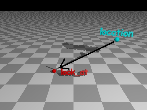 と書きます。 locationはカメラの位置、look_atはカメラが向く位置を示しています。