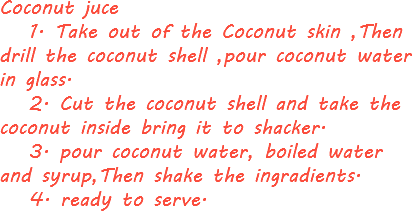 Coconut juce 1. Take out of the Coconut skin ,Then drill the coconut shell ,pour coconut water in glass. 2. Cut the coconut shell and take the coconut inside bring it to shacker. 3. pour coconut water, boiled water and syrup,Then shake the ingradients. 4. ready to serve.